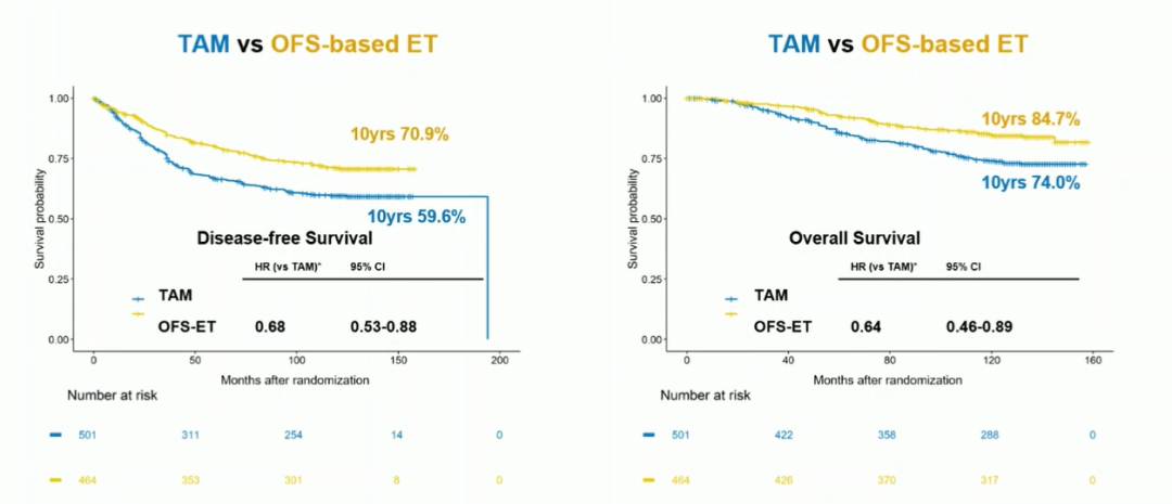 研究结果:研究共纳入965名患者,其中501名(51.9%)仅接受了TAM治疗,464名(48.1%)接受了OFS联合内分泌治疗(TAM[n=269,27.9%]或依西美坦[n=195,20.2%])。联用OFS组患者的10年DFS(OFS 70.9%vs.非OFS 59.6%,P<0.001)和OS(OFS 84.7%vs.非OFS 74.0%,P<0.001)明显更好。同时,OFS的加用与预后改善呈现独立相关性。在内分泌治疗联合OFS组中,使用AI治疗的患者显示出更好的DFS(HR 0.44;95%CI:0.29~0.68;P<0.001)和OS(HR 0.43;95%CI:0.18~0.60;P<0.001)。