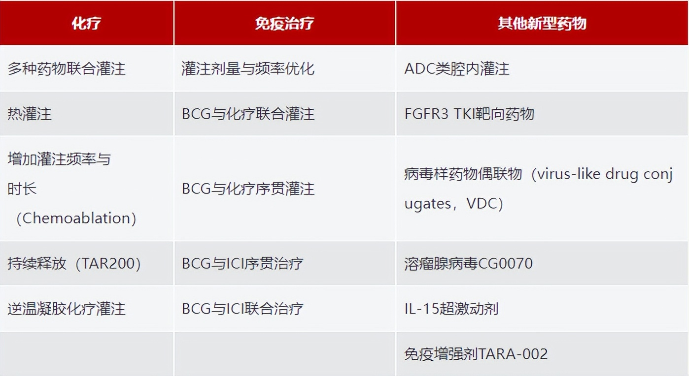 近年来,有诸多研究采用新的局部或系统治疗策略,以应对BCG灌注无反应问题,以及降低复发和进展风险。这些治疗策略涵盖了化疗、免疫治疗以及新型药物的膀胱腔内治疗或系统治疗。