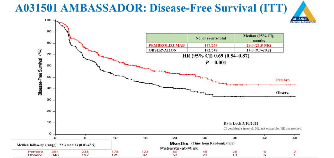 AMBASSADOR研究是另一个ICI辅助治疗MIBC的III期研究。该研究入组患者为新辅助化疗后≥pT2和/或pN+/切缘阳性,以及不适合或拒绝新辅助化疗的≥pT3和/或pN+/切缘阳性患者,术后接受帕博利珠单抗或安慰剂辅助治疗1年。2024年ASCO-GU大会报道达到了研究的主要终点之一DFS:帕博利珠单抗组和对照组的中位DFS分别为29.0个月和14.0个月(HR 0.69,95%CI 0.54~0.87,P=0.001)。但另一个主要终点OS尚无显著差异(50.9 vs 55.8个月,HR 0.98,95%CI:0.76~1.26;P=0.883)[10]