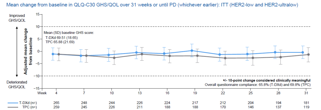 OS虽尚不成熟,但T-DXd在ITT人群、HER2-low、HER2-Ultralow人群也初步展现了获益趋势。在安全性方面,该研究T-DXd安全性特征与既往一致,未见新的安全信号[3]。在生活质量方面,2024年欧洲肿瘤内科学会年会(ESMO)公布的患者报告结局(PRO)数据显示,在ITT人群中,T-DXd与TPC相比,QLQ-C30全身健康状况/生活质量(GHS/QOL)评分较基线变化均值呈现更好的趋势,从而保障了患者生活质量[4]