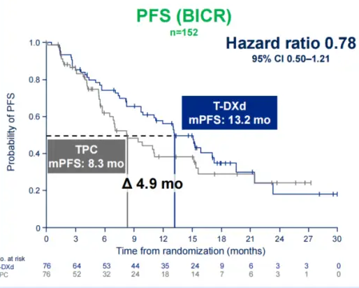在HR+/HER2-ultralow人群中,mPFS则为13.2个月vs 8.3个月,HR=0.78(95%CI 0.50-1.21)。