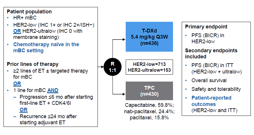 该研究要求入组的患者均未在晚期或转移阶段接受化疗,且在晚期阶段前序接受过≥2线内分泌(ET)±靶向治疗;或ET辅助治疗24个月内复发;或1线CDK4/6抑制剂(CDK4/6i)+ET治疗6个月内进展。主要终点为盲态独立中心(BICR)评估的HR+/HER2-low人群的无进展生存期(PFS),次要终点为PFS、总生存期(OS)、缓解持续时间(DoR)、客观缓解率(ORR)、安全性及耐受性。