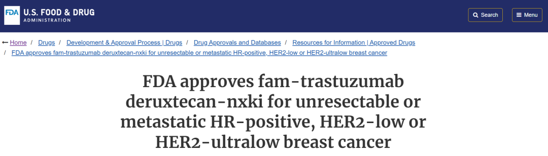 2025年1月27日,FDA批准T-DXd用于治疗在转移阶段经过一种或以上内分泌治疗后进展的,由FDA批准的检测手段确定的HR+,且为HER2-low或HER2-ultralow的不可切除或转移性成人乳腺癌患者[2]