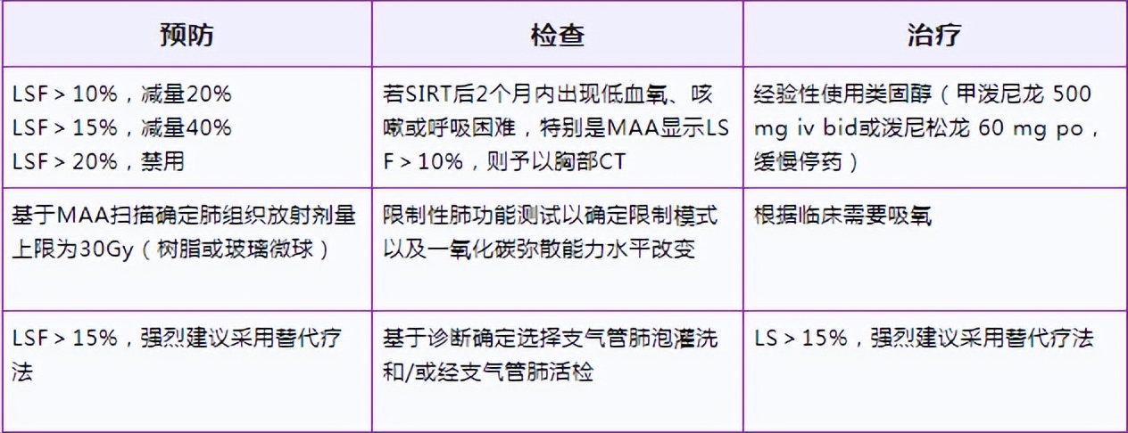 若在SIRT后观察到肺较高的异常摄取,则建议检测血氧饱和度或每1-2周予以6分钟步行测试,在出现血氧饱和度下降或呼吸困难时予以胸部CT检查。任何LSF>10%的患者在SIRT后3个月内出现呼吸困难也应予以胸部CT检查。若观察到特征性的双侧对称性、界限不清的斑片状浑浊或毛玻璃样结节,相对外周/肺门不受累,且可排除感染性或心脏性原因或药物性因素,则应开始治疗。虽然目前暂无证据支持,但一般建议选择类固醇类作为主要治疗药物。对患者予以至少2周的类固醇治疗,再缓慢减量,可以基于经验适当吸氧或加用己酮可可碱。