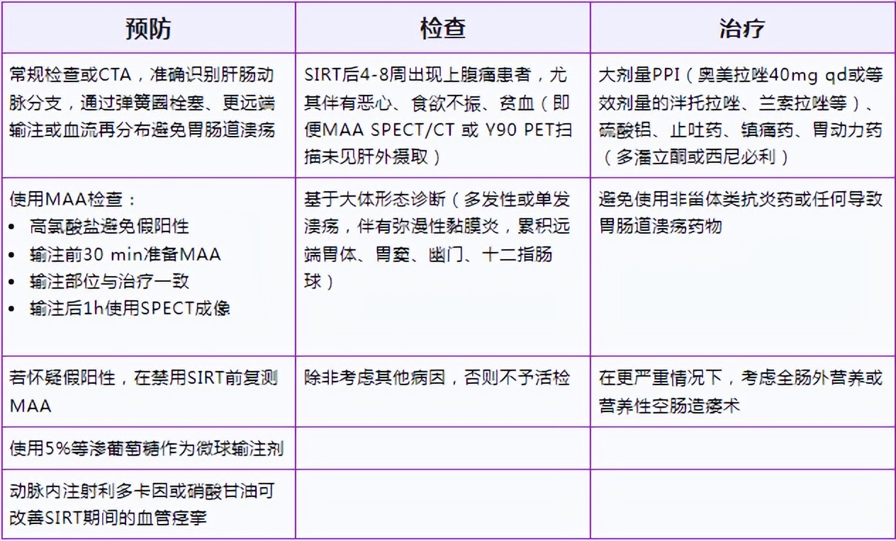 在SIRT后4-8周出现持续性上腹痛患者,应进行上消化道内镜检查;出现贫血或进一步恶化者也鼓励尽早胃镜检查。即便是SIRT后未检出到异常摄取,也需要尽早检查。溃疡的发作模式及病变分布形式多样,若放疗部位愈合不良可能会限制定期活检。