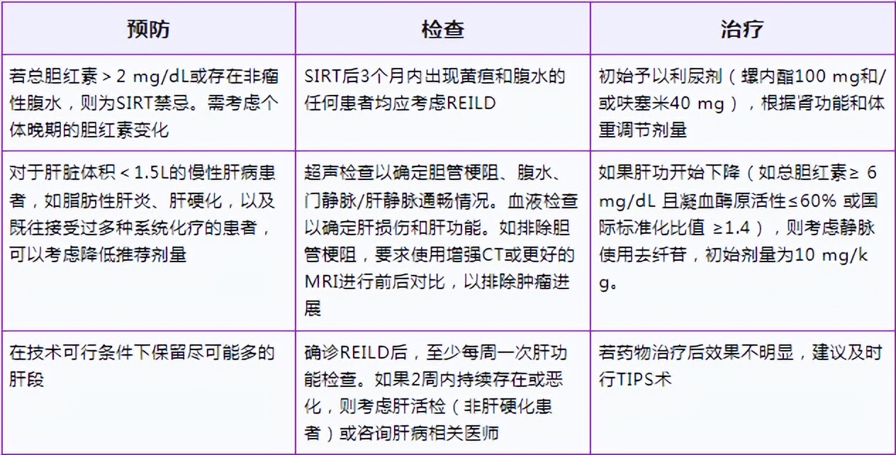 对于SIRT后3个月内出现黄疸或腹水患者,无论是否伴有肝硬化,都需考虑REILD可能性。可对患者进行血液检查,包括总胆红素、碱性磷酸酶和转氨酶。发现总胆红素>3 mg/dL后,应行腹部超声以排除胆管梗阻,并确认腹水的存在以及门静脉和肝静脉的通畅性,并测量肝功能。如果天冬氨酸转氨酶/丙氨酸转氨酶(>1 000 IU/mL)显著升高,应进行其他实验室检查。建议使用对比增强CT或核磁共振成像,以准确评估肝内和肝外肿瘤进展。如果根据检查结果诊断不明确,且病程稳定或恶化,强烈建议尽早进行肝活检,以指导治疗,需注意肝硬化患者不推荐活检。一旦确诊REILD,则需至少每周一次肝功能检查。