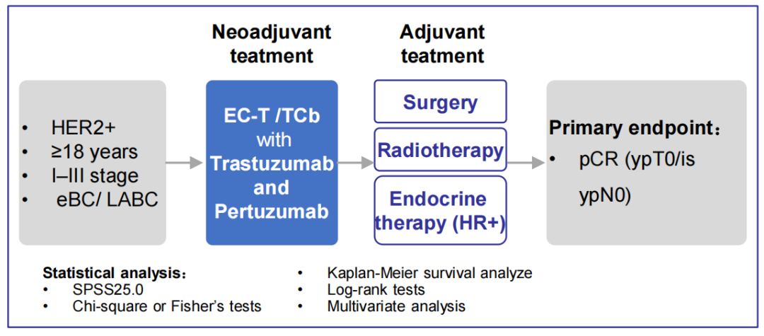 范照青教授:在这次会议上,我们北京大学肿瘤医院乳腺中心与中国人民解放军总医院第五医学中心王涛教授团队联合开展了一项研究,对比了两种新辅助治疗方案在HER2阳性乳腺癌患者中的疗效与安全性。这两种方案分别是:EC-T(表柔比星、环磷酰胺序贯多西他赛)联合双靶向治疗(曲妥珠单抗和帕妥珠单抗),以及TCb(多西他赛、卡铂)联合双靶向治疗。研究的主要终点是评估两组患者在新辅助治疗后的病理完全缓解(pCR)率,次要终点包括无事件生存(EFS)率和副作用对比。