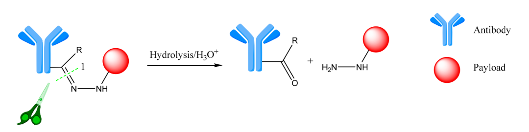 △腙类连接子的水解位点示意图及第一代ADC BR96-Dox结构示意图