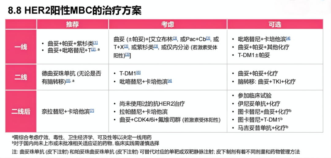 此外,一些新型的抗HER2 ADC药物在三线治疗中也有一定的探索。不过,总体而言,三线治疗的疗效相对有限,患者的生存获益相对较小。2024版《CSCO乳腺癌诊疗指南》中推荐,对于体力状态评分较好的患者,可以选择既往未使用过的方案;对于无法耐受进一步治疗的患者,考虑姑息治疗或参加临床研究。