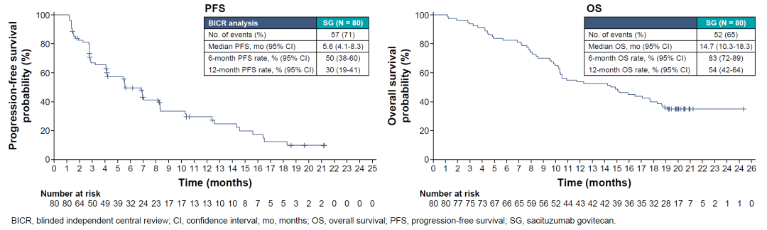 EVER-132-001研究[4,5]是我国开展的Ⅱb期、多中心、单臂临床研究,纳入了我国80例经过≥2种标准治疗方案后进展的、无脑转移的局部晚期或转移性TNBC患者。中位随访14.7个月显示,SG的mPFS为5.6个月,mOS为14.7个月(图3),安全性与全球数据一致,总体取得了与全球人群一致的结果。