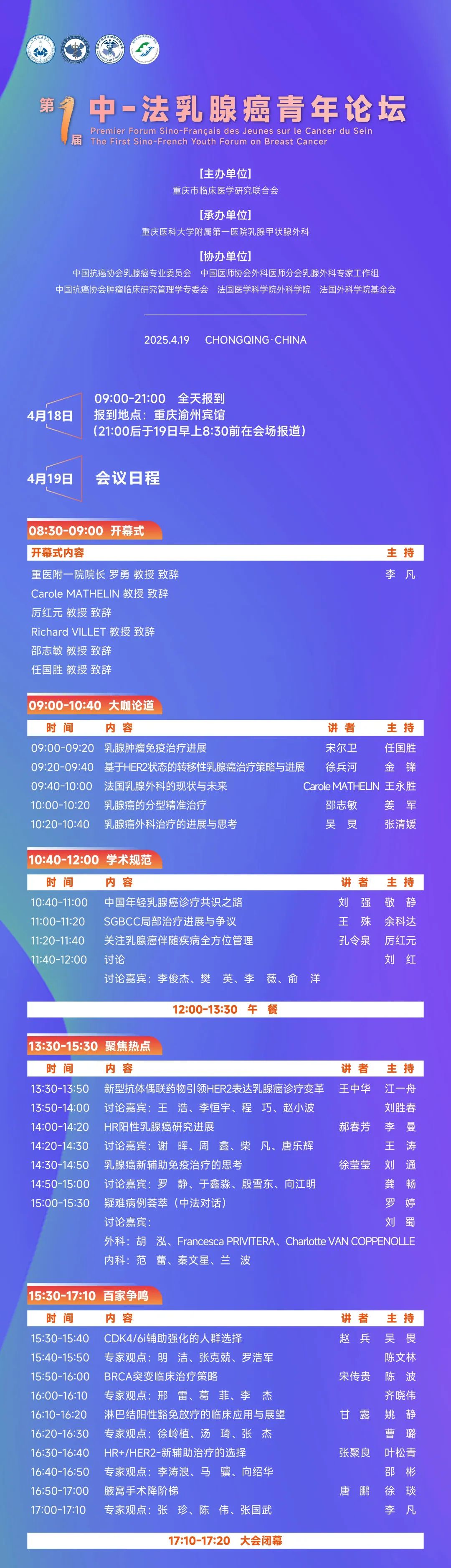 中法交流是重庆医科大学附属第一医院开展的一项重要特色活动,中-法(国际)乳腺癌高级学术论坛在国内也具有广泛影响力。我们希望在老一辈专家已有的中法交流基础上,进一步将学术活动延伸到青年一代,拓展学术交流的深度与广度,推动他们与其他国家的学者进行深入交流与学术碰撞。
