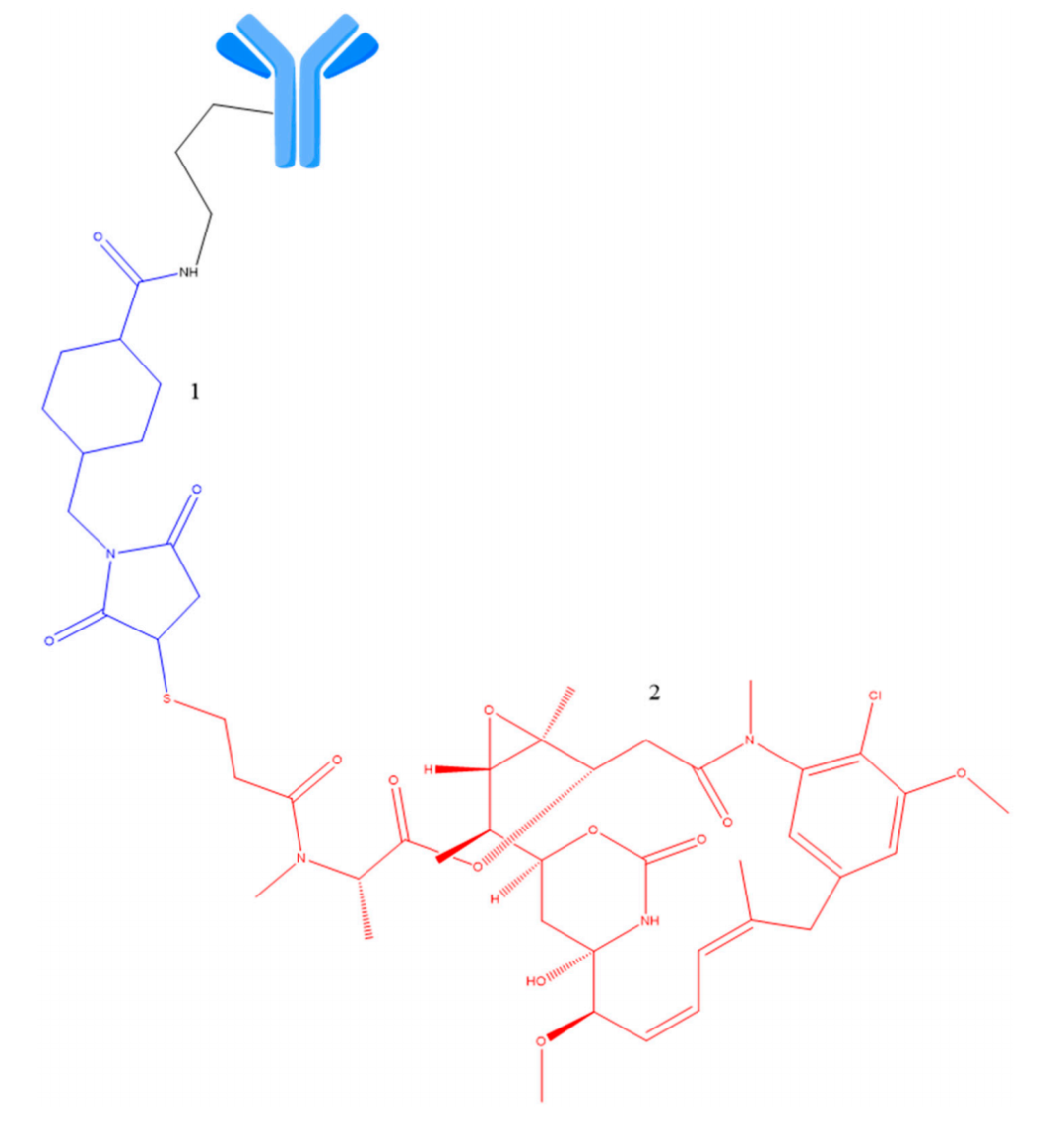 图3.T-DM1的药物结构:1.不可裂解的SMCC连接子(蓝色);2.载荷DM1(红色)