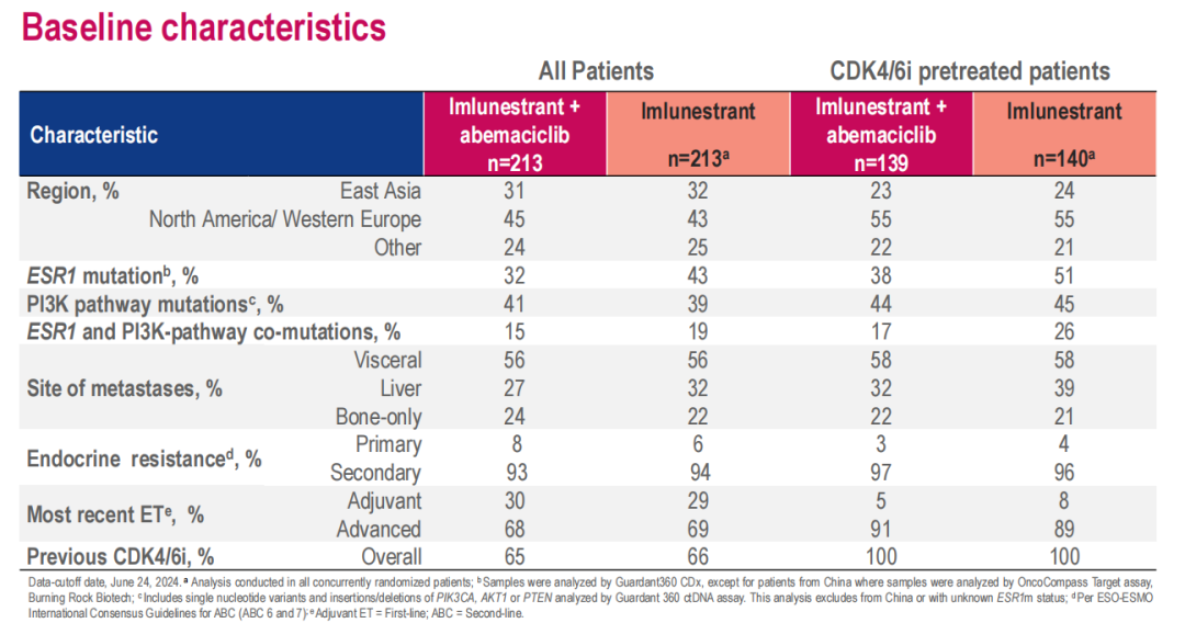 在874例患者中,426例同时被随机分配至Imlunestrant+阿贝西利组或Imlunestrant组(每组n=213);其中大多数(n=279,65%)已接受过CDK4/6i治疗。在CDK4/6i经治患者中,基线特征基本平衡;56%有内脏转移,37%有ESR1突变,40%有PI3K通路突变。大多数患者(70%)接受CDK4/6i治疗的时间≥12个月。