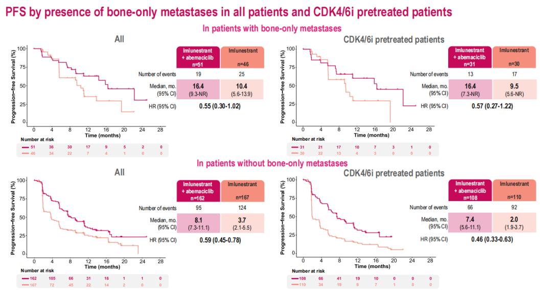 在CDK4/6i经治的患者中,Imlunestrant+阿贝西利组相较于Imlunestrant组显示出PFS获益(中位PFS 9.1个月vs 3.7个月;HR=0.51,95%CI:0.38~0.68)。