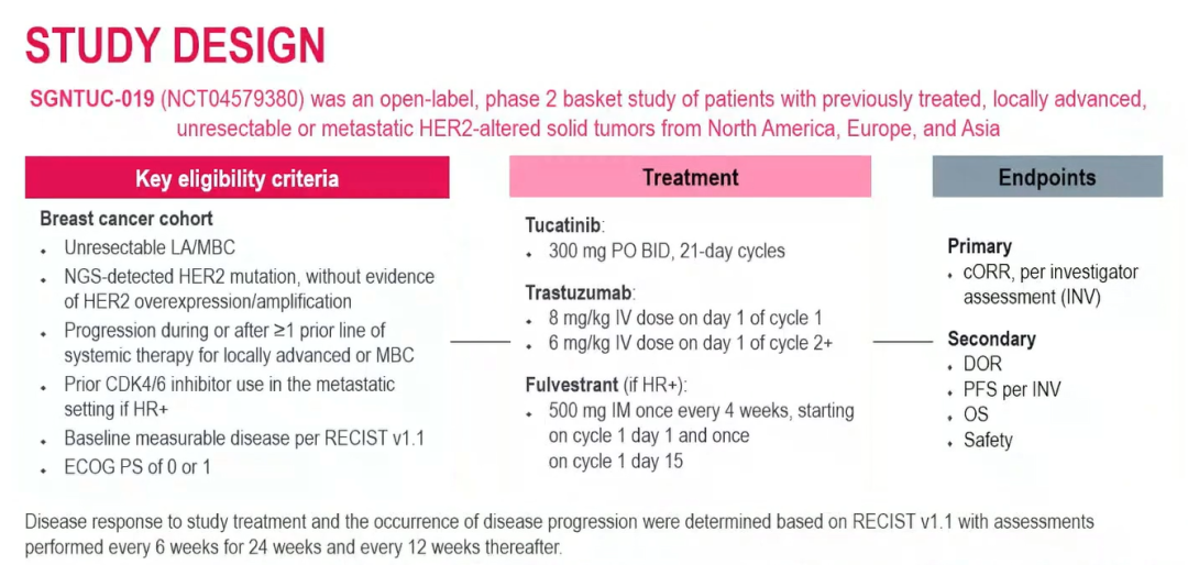 研究纳入经二代测序(NGS)确认HER2突变(无扩增)、局部晚期(LA)或转移性乳腺癌(MBC)患者,要求患者至少接受一线全身治疗后进展,若为激素受体阳性(HR+)则需既往接受过CDK4/6抑制剂治疗。治疗方案为图卡替尼(300 mg口服,每日两次)联合曲妥珠单抗(8 mg/kg静脉负荷剂量后6 mg/kg,每3周一次),21天为一周期。HR+患者还需接受氟维司群(500 mg肌注,C1D1,每4周一次,并在C1D15追加一次)。主要终点为研究者评估的确认客观缓解率(cORR-INV);次要终点包括缓解持续时间(DOR)、无进展生存期(PFS)、总生存期(OS)及安全性。