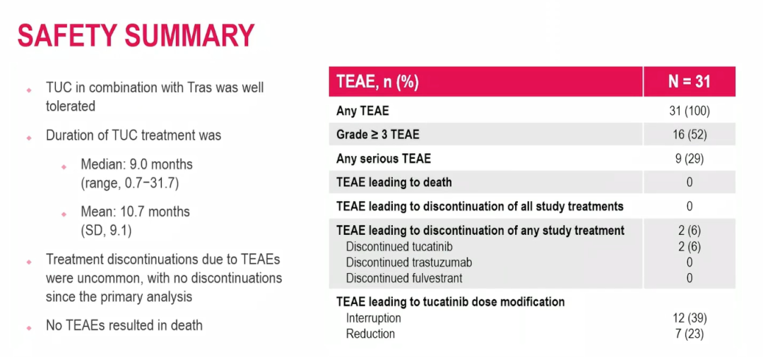 最常见的治疗期间不良事件(TEAE)为腹泻(71%)和恶心(39%)。最常见的≥3级TEAE为腹泻(13%)、ALT升高(10%)及高血压(10%)。2例(6%)患者因TEAE停用图卡替尼,但继续接受曲妥珠单抗治疗,无TEAE相关死亡事件。