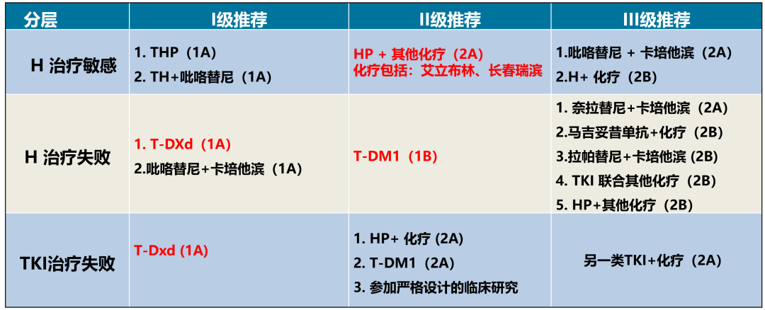 近期,中国临床肿瘤学会(CSCO)乳腺癌诊疗指南更新,为乳腺癌患者带来了新的方案与获益依据。对于HER2阳性(HER2+)晚期人群,本次更新依然强调了针对曲妥珠单抗(H)敏感、H耐药以及酪氨酸激酶抑制剂(TKI)耐药患者的分层治疗策略[1]。对于H敏感患者,曲妥珠帕妥珠单抗双靶联合紫杉醇(THP)方案以及TH+吡咯替尼方案依然是目前的一线标准治疗方案。对于H治疗失败的患者,靶向HER2的抗体偶联药物(ADC)T-DXd成为I级方案(1A)首选推荐。对于TKI治疗失败患者,T-DXd从二线治疗II级推荐提升至I级推荐(1A)。