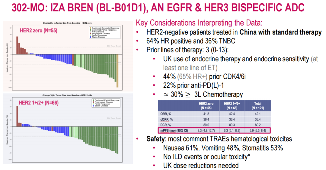 张剑教授:302MO这项研究是由吴炅教授和我共同牵头发起的,由杜益群教授在本届ESMO BC年会上做口头报告,呈现研究相关内容。这项临床研究主要是基于当前非常热门的双抗ADC iza-bren(BL-B01D1)展开的,该药物由EGFR x HER3双特异性抗体通过稳定的四肽可裂解连接子与新型拓扑异构酶I抑制剂有效载荷(Ed-04)偶联而成。既往该药物已经在肺癌患者治疗当中产生了一定的疗效,本研究旨在探索该药物在既往接受过治疗的HER2阴性(HER2-)乳腺癌患者中的安全性和有效性。