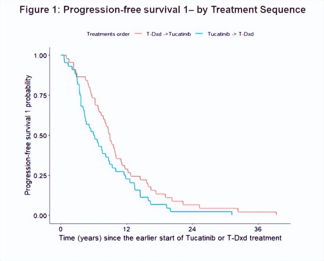 对于在图卡替尼之前接受T-DXd治疗的患者,PFS1定义为从开始T-DXd治疗到疾病进展、死亡或最后一次随访的时间。PFS2定义为从开始图卡替尼治疗到最早出现疾病进展、死亡或最后一次随访的时间。使用Kaplan-Meier曲线、对数秩检验和COX比例风险模型进行分析(P<0.05),分析在R 4.2.2软件中进行。