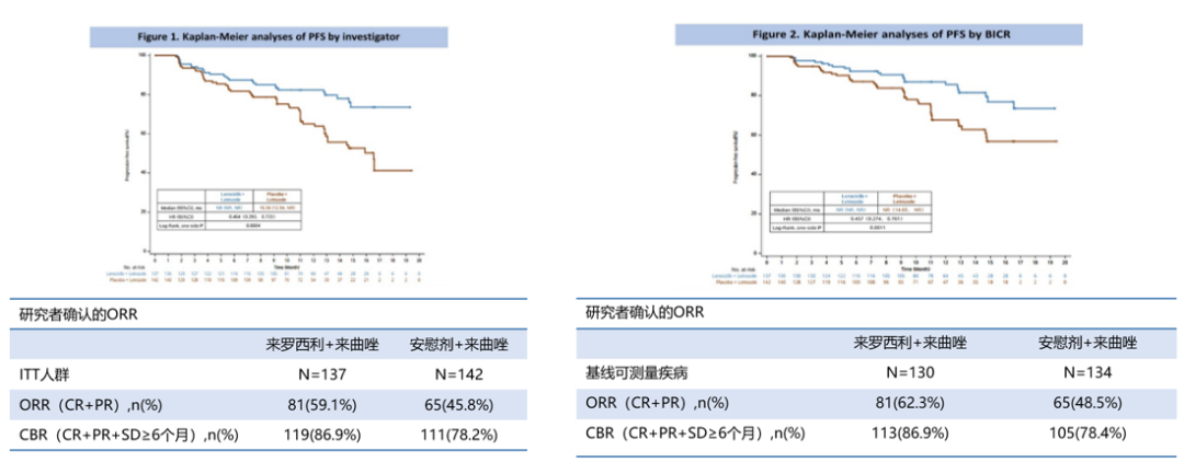 与对照组相比,研究组显著改善患者的PFS[中位数:未达到(NR)vs 16.56个月;HR:0.464,95%Cl:0.293~0.733;P=0.0004],疾病进展或死亡风险降低约54%。此外,研究者评估和独立评审委员会(IRC)评估的PFS都显示出一致获益。在ORR和CBR方面,来罗西利+来曲唑也显示出了较好的临床获益。