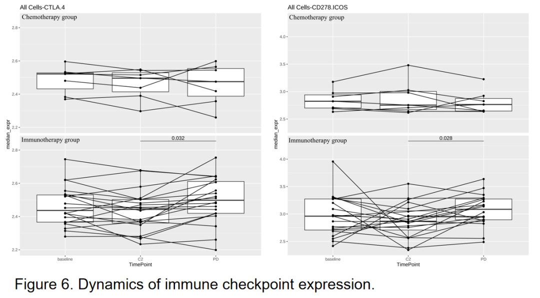 同时,疾病进展时总细胞的CTLA-4、ICOS表达较治疗2周期后显著增高,提示可能与免疫治疗耐药有关。