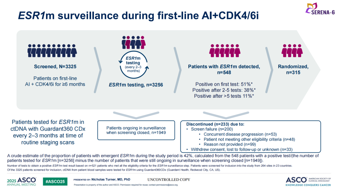 郭宝良教授:SERENA-6是一项III期双盲、随机研究,旨在评估Camizestrant与CDK4/6抑制剂(包括哌柏西利、瑞波西利、阿贝西利)联合治疗相较于AI与CDK4/6抑制剂联合治疗在疾病进展之前出现ESR1突变(ESR1m)的HR+/HER2-晚期乳腺癌中的疗效和安全性。研究共纳入3256例已接受至少6个月一线AI(阿那曲唑/来曲唑)+CDK4/6抑制剂治疗的HR+/HER2-晚期乳腺癌患者,每2-3个月进行一次ctDNA检测以筛查ESR1m,并与常规影像学检查同步进行。