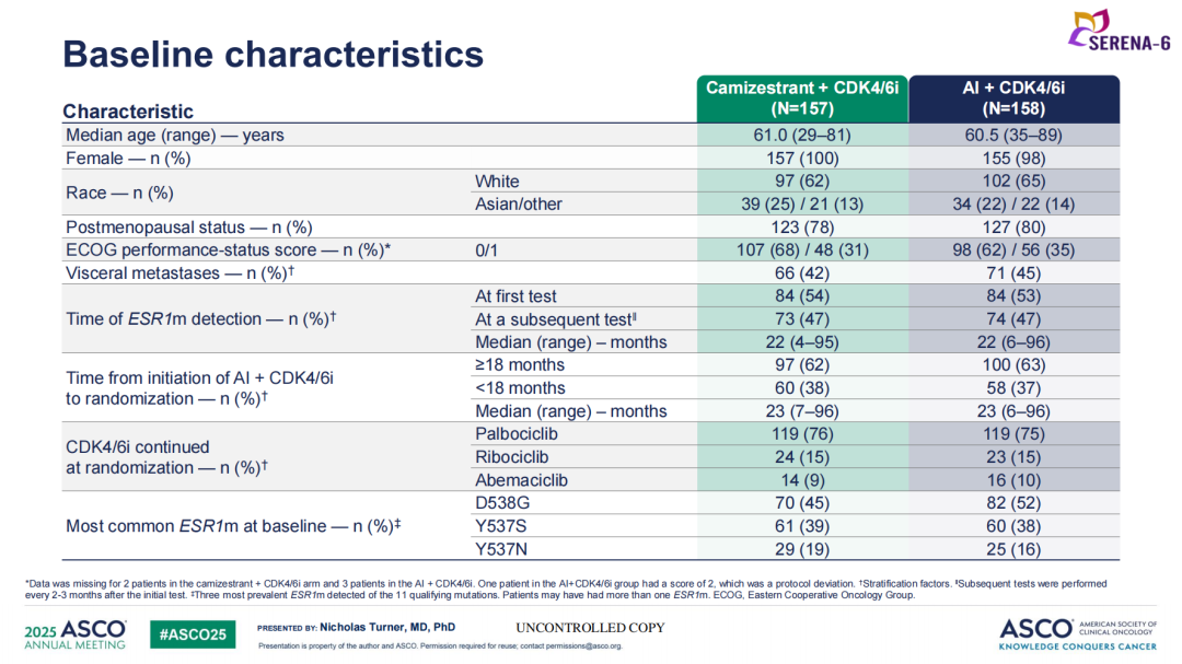 在315例检测到ESR1m且无疾病进展的患者中,按1:1比例随机分配至Camizestrant(75mg)联合持续CDK4/6抑制剂(类型和剂量保持不变)+AI安慰剂治疗组(Camizestrant治疗组;157例患者),或AI+CDK4/6抑制剂+Camizestrant安慰剂组(AI治疗组;158例患者),两组患者基线特征平衡。主要终点为研究者评估的PFS(根据RECIST v1.1标准)。