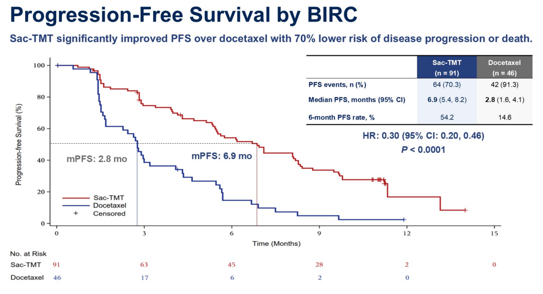 芦康沙妥珠单抗组中位PFS相较于多西他赛组延长4.1个月(BICR评估:6.9 vs 2.8个月),疾病进展或死亡风险显著降低70%(HR 0.30,95%CI:0.20~0.46,单侧P<0.0001)。