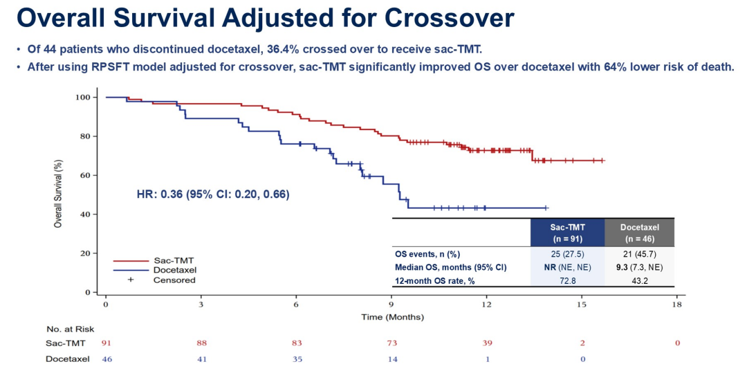 两组中位OS目前均为未达到(NR),但芦康沙妥珠单抗组相较于多西他赛组的死亡风险显著降低51%(HR 0.49,95%CI:0.27~0.88,单侧P=0.007)。值得注意的是,本研究允许多西他赛组治疗失败的患者交叉至芦康沙妥珠单抗组,校正后的HR仅为0.36(95%CI:0.20~0.66),死亡风险下降64%。