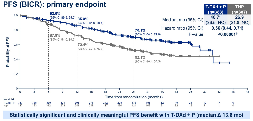 本次ASCO大会报道了DB-09研究中T-DXd+P对比THP的中期分析结果,T-DXd单药组预计在PFS最终分析时报道。从此次披露的数据来看,T-DXd+P组的中位PFS引起了广泛关注,达到了40.7个月,相比THP组的26.9个月延长一年多(13.8个月),风险比(HR)仅为0.56(95%CI:0.44~0.71,P<0.00001),意味着T-DXd+P一线治疗可使疾病进展和死亡风险显著降低44%,这是一个非常大的进步,并且是非常有临床意义的PFS数据改善。