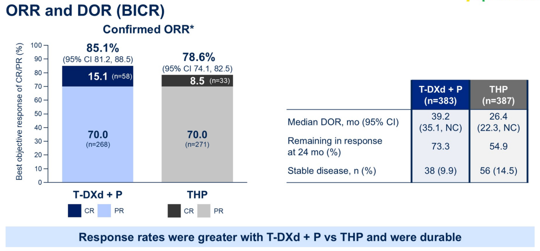 从肿瘤缓解数据来看,T-DXd+P组的完全缓解(CR)率达到了15.1%,尽管从数值上来看略低于DB-03研究二线治疗的CR率,但在本研究中也接近THP组(8.5%)的2倍。无论如何,对于晚期患者而言能够达到完全缓解实属难能可贵,而总体上T-DXd+P组的客观缓解率(ORR)也高达85.1%,高于THP组的78.6%。