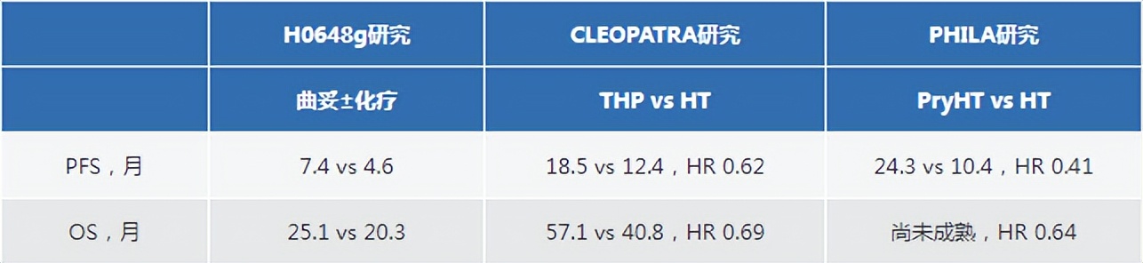 我们对CLEOPATRA研究的数据已经非常熟悉,THP一线治疗的中位无进展生存期(PFS)可以达到一年半,总生存期(OS)时间也接近5年,达到了57.1个月,这已几乎成为我们长期以来对HER2阳性乳腺癌一线治疗获益的固有认知。PHILA临床研究虽然暂时没有中位OS数据,但中位PFS数据与CLEOPATRA临床研究相比也有进一步延长,达到了24.3个月。