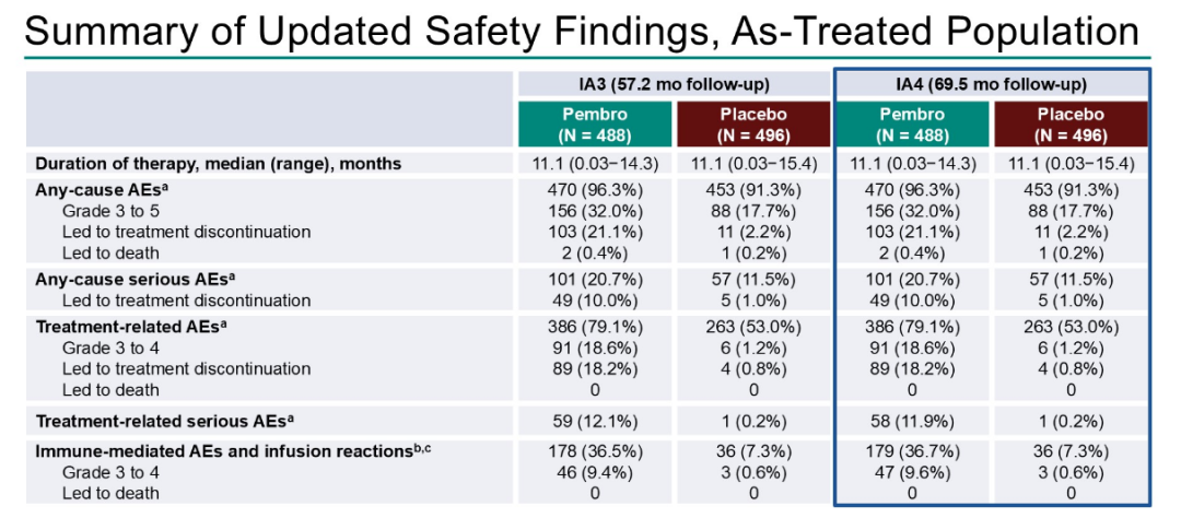 经过5年的随访,与安慰剂相比,帕博利珠单抗辅助治疗获益与既往分析一致,包括在所有亚组。没有发生新的严重治疗相关安全信号。帕博利珠单抗辅助治疗仍然是RCC复发风险增加患者的一线治疗选择。