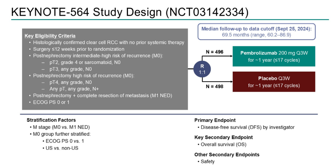 KEYNOTE-564是一项、双盲、安慰剂对照的3期研究,纳入了中高危(pT2 Gr 4或肉瘤样,或pT3Gr,N0 M0)或高危(pT4任何Gr,N0 M0,或任何pT和Gr,N M0)或M1且无证据(NED)的成人ccRCC患者,并在肾切除术和/或转移切除术12周前随机(1:1)接受帕博利珠单抗200 mg或安慰剂IV Q3W治疗。治疗持续约1年(17个周期),或直到复发、无法忍受的AEs或医生停止治疗。