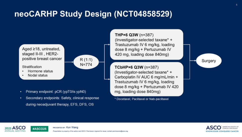 在HER2阳性早期乳腺癌新辅助治疗领域,降阶梯治疗成为当前研究热点。目前国内外指南推荐的标准方案是6个周期的TCbHP方案(曲妥珠单抗+帕妥珠单抗+紫杉类+卡铂),该方案基于KRISTINE、TRYPHAENA、TRAIN-2等研究证据,在病理完全缓解(pCR)率和生存获益方面表现优异。然而,卡铂带来的血液学毒性和胃肠道反应等不良反应,促使研究者探索更优的治疗策略。