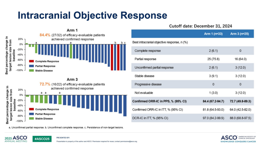 REIN研究则专门评估了SHR-A1811在HER2阳性乳腺癌脑转移中的治疗价值。研究纳入HER2阳性或低表达乳腺癌患者,需至少存在一处未经放疗且可测量的颅内病灶。HER2阳性患者中,第1组接受SHR-A1811(6.4 mg/kg,每3周一次),第3组接受SHR-A1811(4.8 mg/kg)联合贝伐珠单抗(15 mg/kg,每3周一次)治疗,直至疾病进展、出现不可耐受毒性或确认无临床获益。主要终点为根据RANO-BM标准评估的颅内客观缓解率(ORR-IC)。研究显示,SHR-A1811 6.4mg/kg剂量单药(符合方案患者32例)和4.8mg/kg剂量联合贝伐珠单抗(符合方案患者22例)均对于HER2阳性乳腺癌伴活动性脑转移实现了良好的颅内客观缓解率,分别达到了84.4%和72.7%,单药队列的中位无进展生存期(mPFS)达到13.2个月,联合队列PFS数据还不成熟。这项研究结果为HER2阳性乳腺癌伴活动性脑转移患者提供了全新的治疗选择。