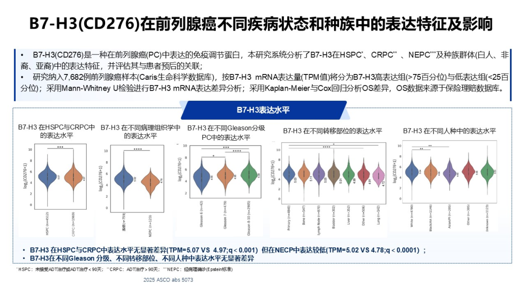 B7-H3(CD276)作为新兴靶点,近年来表现突出。陈教授引用了2025年ASCO大会数据,指出B7-H3表达在前列腺癌不同阶段、不同人种中具有广泛性且与预后密切相关。针对B7-H3的ADC药物(如MHB088C、DB-1311)在临床研究中展现出积极疗效及良好安全性,显示了其广阔的精准治疗前景。
