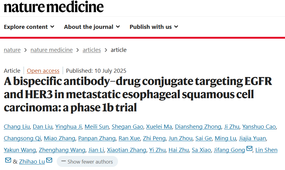 《自然-医学》(Nature Medicine,IF=50.0)于2025年7月10日在线发布了北京大学肿瘤医院沈琳教授团队牵头的“A bispecific antibody–drug conjugate targeting EGFR and HER3 in metastatic esophageal squamous cell carcinoma:a phase 1b trial”。该研究聚焦新型靶向EGFR和HER3的双靶点抗体-抗体偶联药物(ADC)BL-B01D1,初步验证了其在晚期食管鳞癌(ESCC)客观缓解率可达29.3%,安全性可控,具有良好的临床应用前景,为食管鳞癌患者提供了潜在的创新治疗方向。