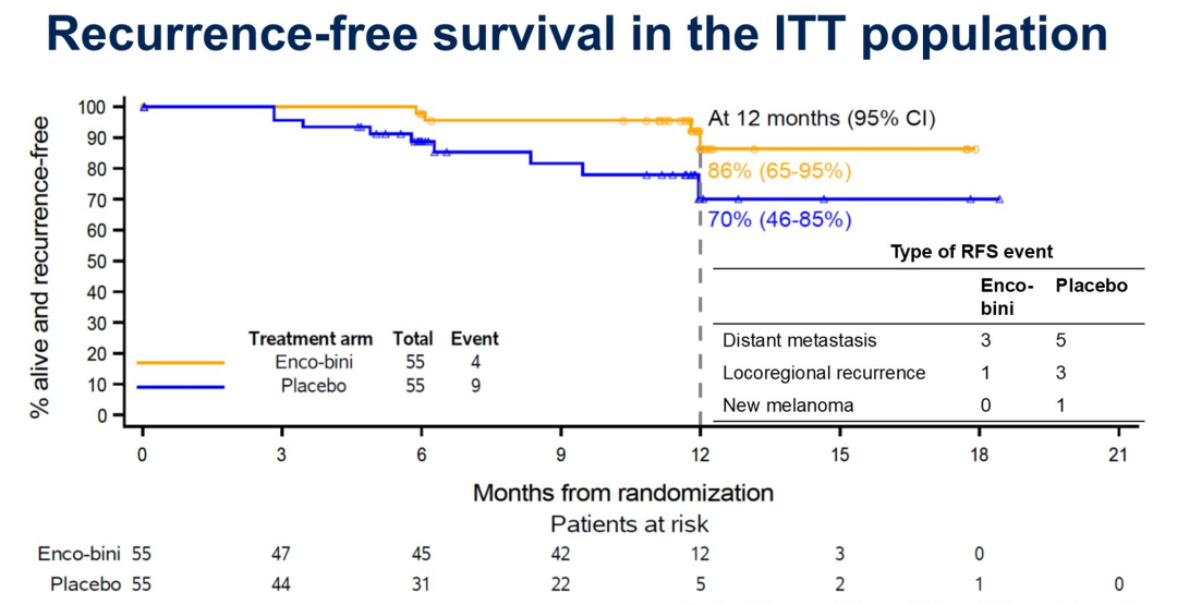达拉非尼联合曲美替尼在BRAF突变的III期皮肤黑色素瘤辅助中可降低32%的1年复发风险(1年RFS 88%vs安慰剂56%),4年RFS率提升了16%(54%vs 38%)[6,7]。在II期BRAF-V600E/K突变皮肤型患者中,今年ASCO大会中的EORTC-2139-MG/Columbus-AD III期研究显示,BRAF抑制剂Encorafenib联合MEK抑制剂Binimetinib(E+B)辅助治疗的1年RFS率提升了16%(86%vs 70%),DMFS率为92%(安慰剂组82%)。尽管安全性可控(3级以上毒性24%),但因PD-1单抗在同类适应症中的优先获批(如KEYNOTE-716的1年RFS 90%),该研究提前终止,仅入组110例患者,最终转为安全性探索性分析。