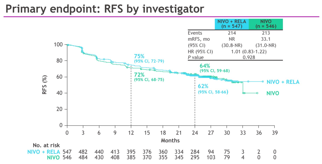 2024年ESMO大会上公布了KEYNOTE 054的7年随访结果,PD-1单抗单药辅助可降低III期皮肤型黑色素瘤14%的复发风险(PD-1单抗50%vs安慰剂组36%)。但双免是否能进一步降低复发风险,为此,RELATIVITY 098研究在III-IV期黑色素瘤开展了LAG3单抗Relatilimab联合Nivolumab对比Nivolumab单药辅助的多中心3期临床试验,经中位随访26.7个月后,两组RFS无显著差异。NIVO+RELA和NIVO单药组的1年RFS率分别为75%和72%,2年RFS率62%和64%。