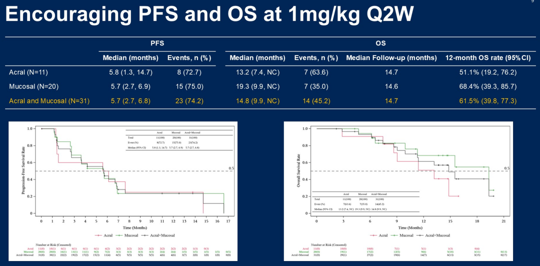 我国肢端及黏膜黑色素瘤对免疫治疗反应欠佳,免疫单药在晚期肢端及黏膜中ORR(客观缓解率)仅在15%左右,PFS(无进展生存)不足3个月[3,4],亟待开发更有效的新型免疫治疗策略。今年ASCO大会公布了一项PD-1/IL-2a偏向激动剂双抗IBI363在免疫经治的肢端和黏膜黑色素瘤中开展的1/2期研究,结果显示,总体ORR达26.7%(肢端型20%,黏膜型25%),DCR 76.7%,中位PFS 5.7个月、OS 14.7个月(黏膜亚型达19.3个月)。安全性方面,3级以上TRAE发生率29%,仅3.3%因毒性停药。