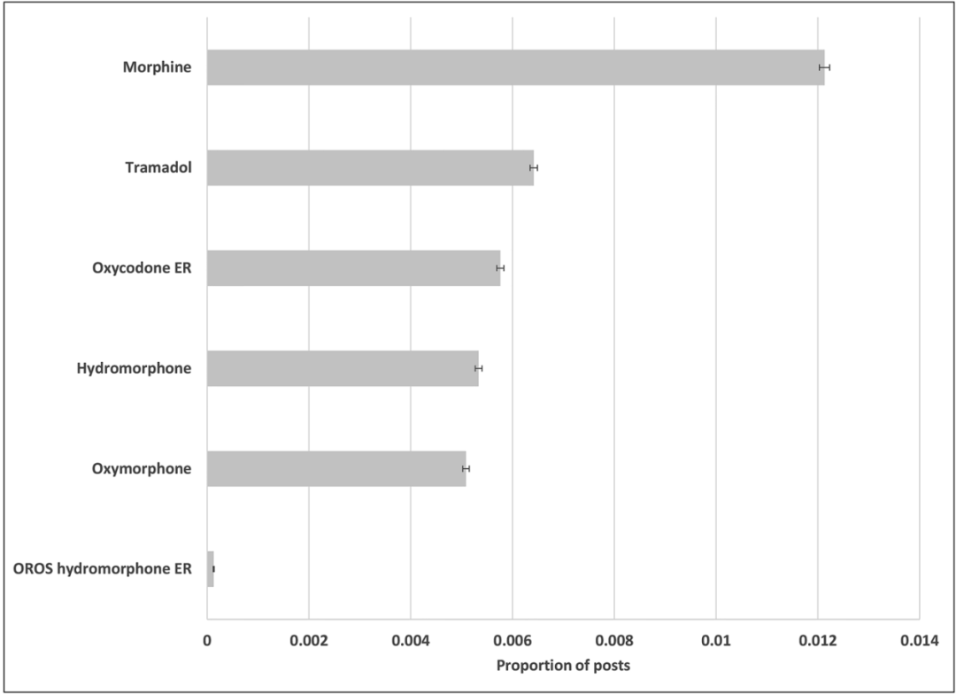 图6 OROS氢吗啡酮缓释片与其他阿片类药物在网络论坛讨论中的相对占比