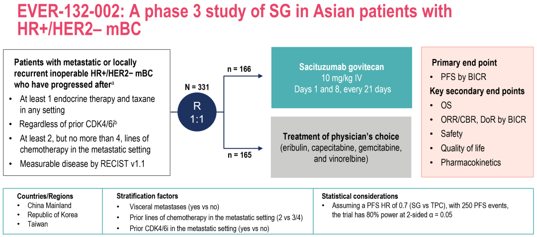 EVER-132-002研究是一项针对既往2-4次化疗经治的HR+/HER2-转移性乳腺癌的Ⅲ期、多中心、随机对照研究,共入组331例亚裔患者(中国大陆约70%),其中约50%的患者接受过CDK4/6i治疗,将患者按1:1随机分组后分别予以戈沙妥珠单抗或TPC治疗。2024年,由中国医学科学院肿瘤医院徐兵河教授作为第一作者,在《Nature Medicine》披露了该研究的初步结果,验证了戈沙妥珠单抗在亚裔患者的疗效、安全性以及生活质量[2]。