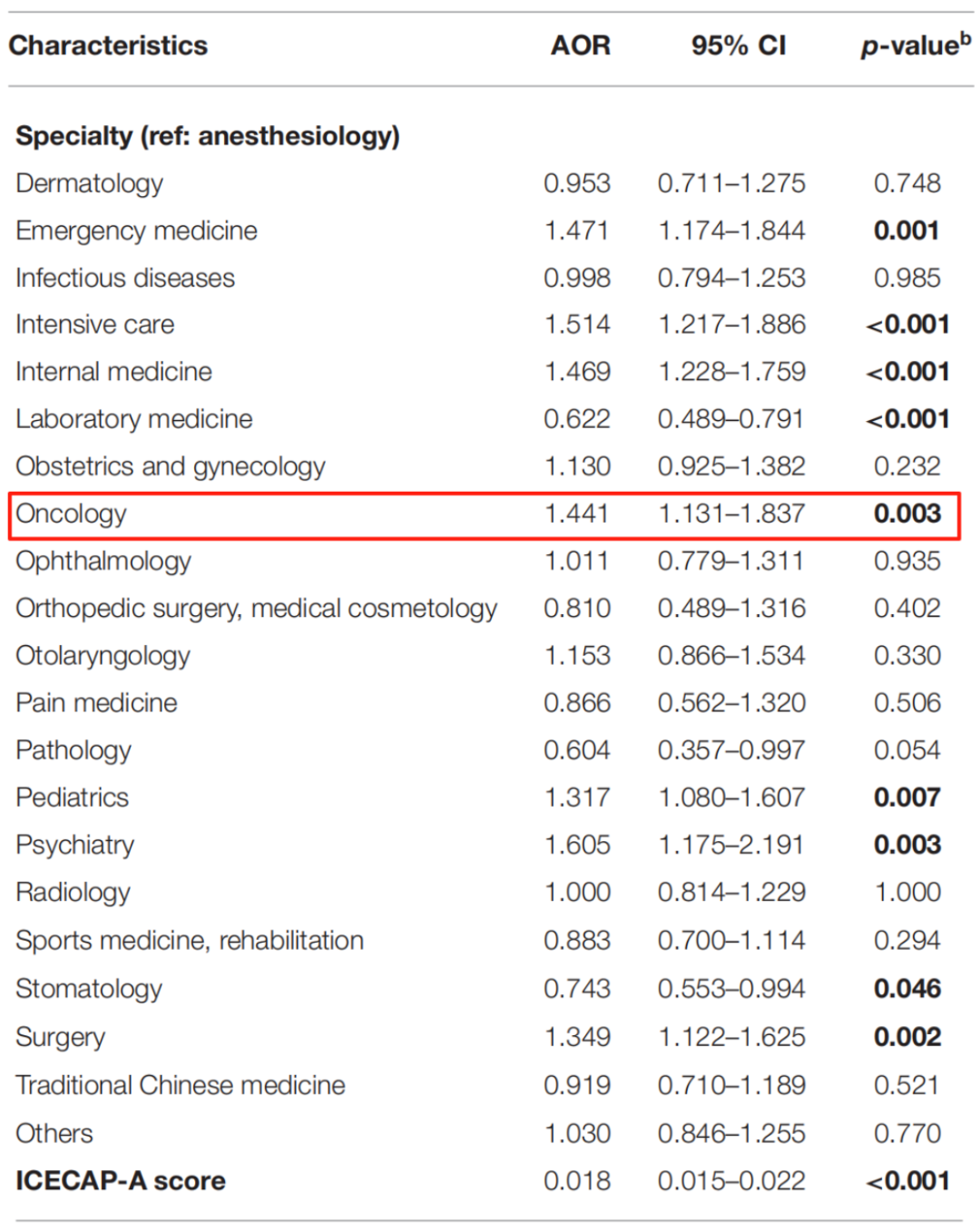 虽然本研究未专门分析肿瘤科数据,但其中不同专科间的差异显著。与职业倦怠高风险相关的专科包括: