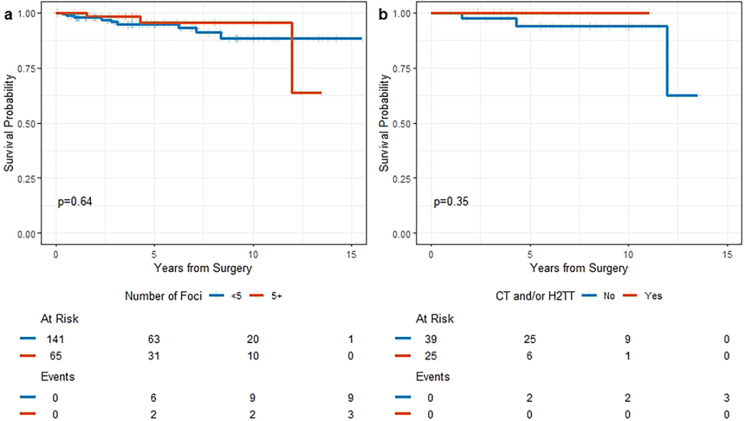 考虑到局部区域复发可能进行治愈性挽救治疗,研究者分析了远处复发的频率和性质。患者1在诊断为HER2+/HR-DCIS-MI时,存在9个MI灶。她未接受任何辅助全身治疗。她在术后18.9个月出现肝脏HER2+/HR-复发。患者2在诊断为三阳性DCIS-MI时,存在2个MI灶。她接受了保乳手术并再次进行肿瘤切除。术后五周,她开始接受辅助TH治疗,但由于进行性神经病变,在约9周时停用了紫杉醇。患者在最后一次接受TH治疗两周后(术后3.8个月)被发现患有软脑膜疾病。由于她在确诊时没有神经系统症状,因此在初始分期中未进行影像学检查和中枢神经系统评估,因此无法排除患者患有隐匿性转移性疾病。总体而言,每个亚组(1-4个和≥5个心肌梗死灶)中均有1例患者出现远处复发。
