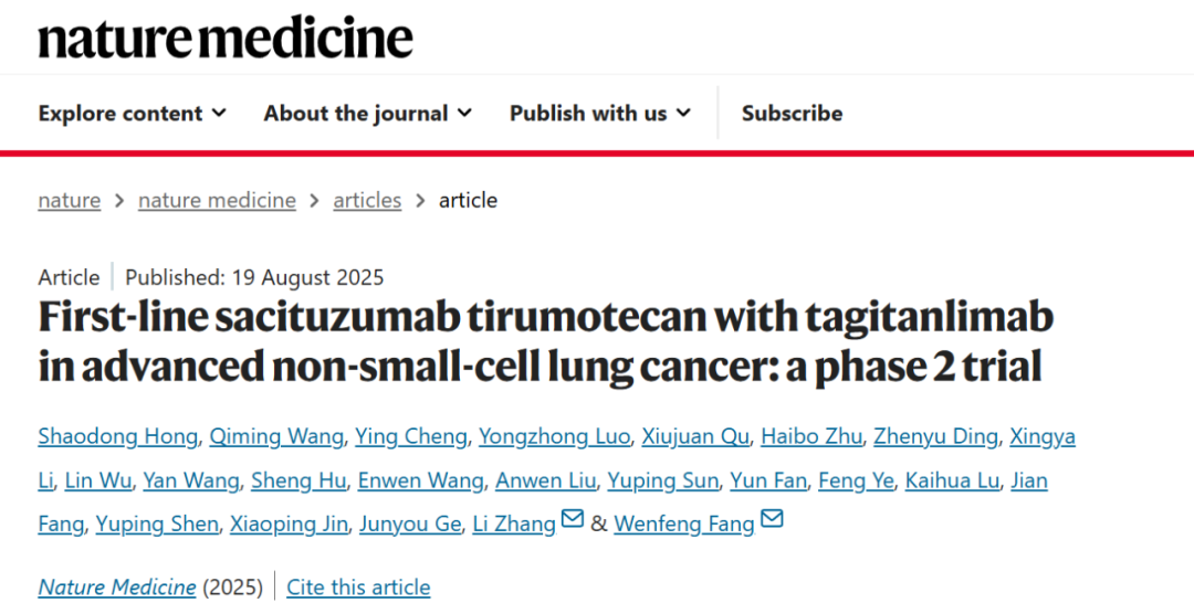 2025年8月19日,国际顶级医学期刊《自然·医学》(Nature Medicine)再次迎来中山大学肿瘤防治中心张力教授、方文峰教授团队的重磅成果——OptiTROP-Lung01研究全文发表。这是该团队继2025年4月10日在《自然·医学》发布芦康沙妥珠单抗针对经治晚期非小细胞肺癌(NSCLC)的I/II期数据、6月5日在《英国医学杂志》(The BMJ)公布OptiTROP-Lung03研究更新结果后,第三次以“中国方案”登陆国际顶刊,此次研究首次公布芦康沙妥珠单抗联合塔戈利单抗(tagitanlimab)一线治疗驱动基因阴性晚期或转移性NSCLC的II期临床研究数据,提示TROP2抗体药物偶联(ADC)芦康沙妥珠单抗联合免疫治疗有望进一步提升患者获益。