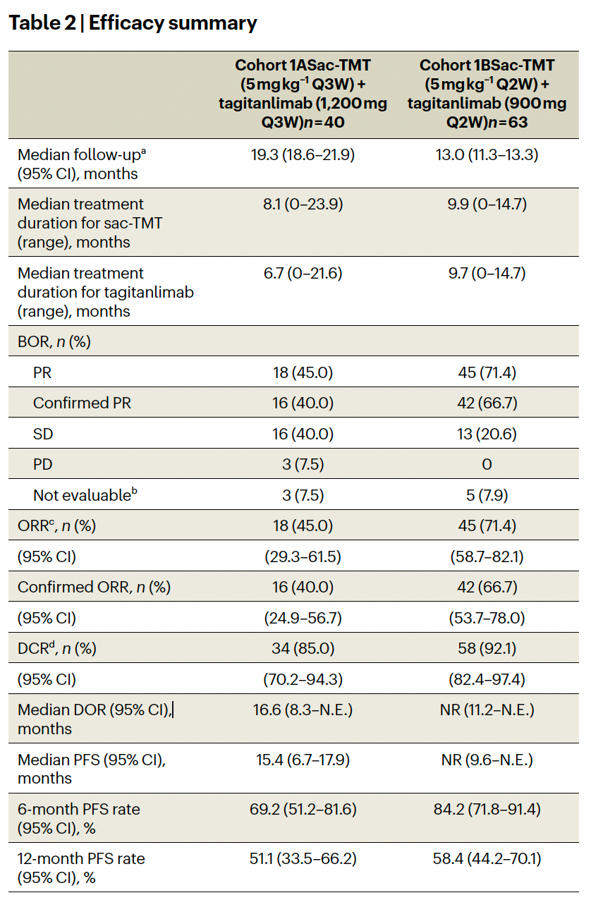 这项多中心、多队列、开放标签、II期OptiTROP-Lung01研究(NCT 05351788)旨在评估芦康沙妥珠单抗(TROP2 ADC)联合塔戈利单抗(KL-A167)(抗PD-L1单抗)一线治疗驱动基因阴性晚期或转移性NSCLC患者的安全性、耐受性和疗效。入组患者以非随机方式接受芦康沙妥珠单抗(5mg/kg,Q3W)和塔戈利单抗(1200mg,Q3W)(队列1A,N=40),每三周为一个周期;或芦康沙妥珠单抗(5mg/kg,Q2W)和塔戈利单抗(900mg,Q2W)(队列1B,N=63),每四周为一个周期,直至疾病进展或出现不可耐受毒性。主要终点包括安全性和客观缓解率(ORR)。