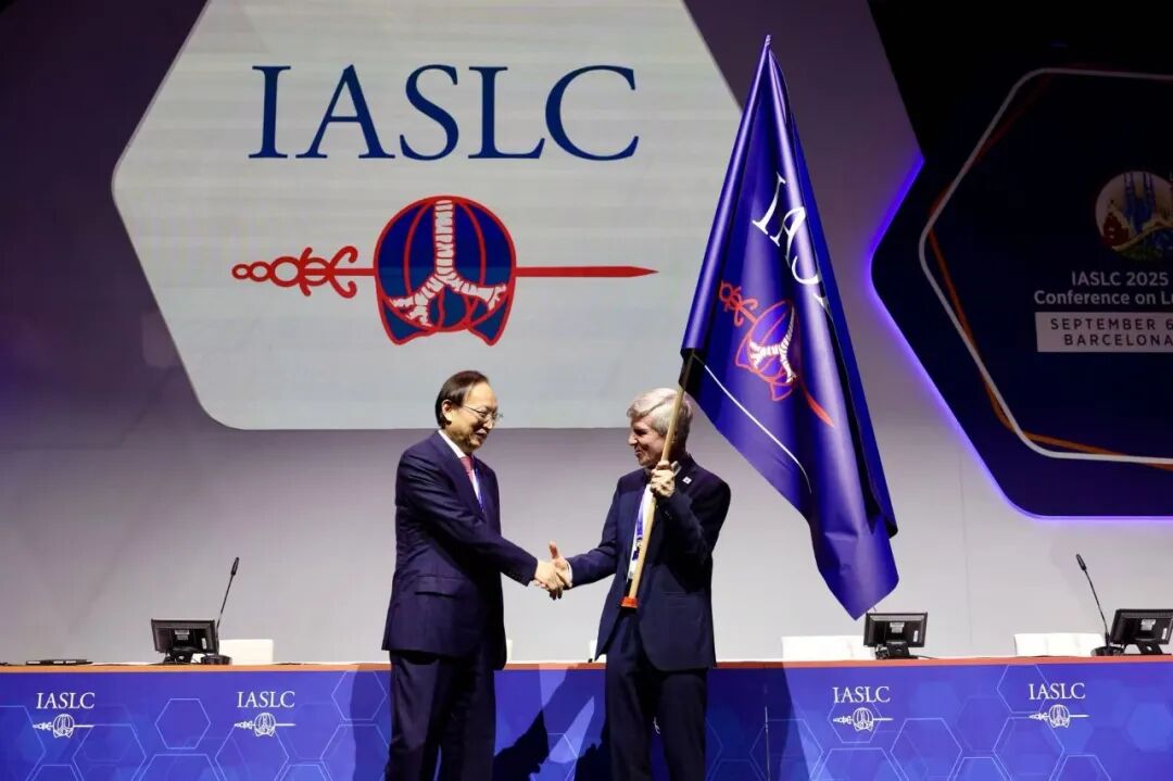 随后,Paul Van Schil教授将象征IASLC学术使命与引领责任的旗帜,郑重交予同济大学附属东方医院的周彩存教授。这一交接不仅是IASLC学术传承的关键节点,更标志着协会正式开启由中国专家领衔、携手全球同仁共促胸部肿瘤诊疗事业进步的全新篇章。