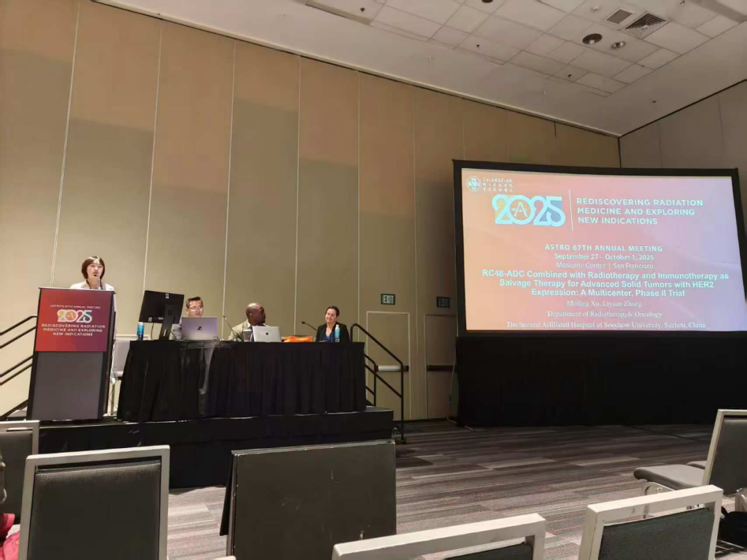 苏州大学附属第二医院(布拉格治疗中心)徐美玲博士在大会上报告了PRaG 3.0研究的多中心II期临床试验,该研究将“生物导弹”靶向HER2抗体偶联药物(ADC)RC48与创新的免疫放射疗法(布拉格治疗)相结合,在已无标准治疗选择的晚期实体瘤患者中,展现出卓越的疗效和可控的安全性。该研究与ASTRO 2025年会“重塑放射医学”的主题完美契合,突出展示了靶向治疗、免疫治疗与放射治疗之间的全新协同作用,成功将放疗从一种局部治疗手段,转变为激发全身性抗肿瘤攻击的催化剂。
