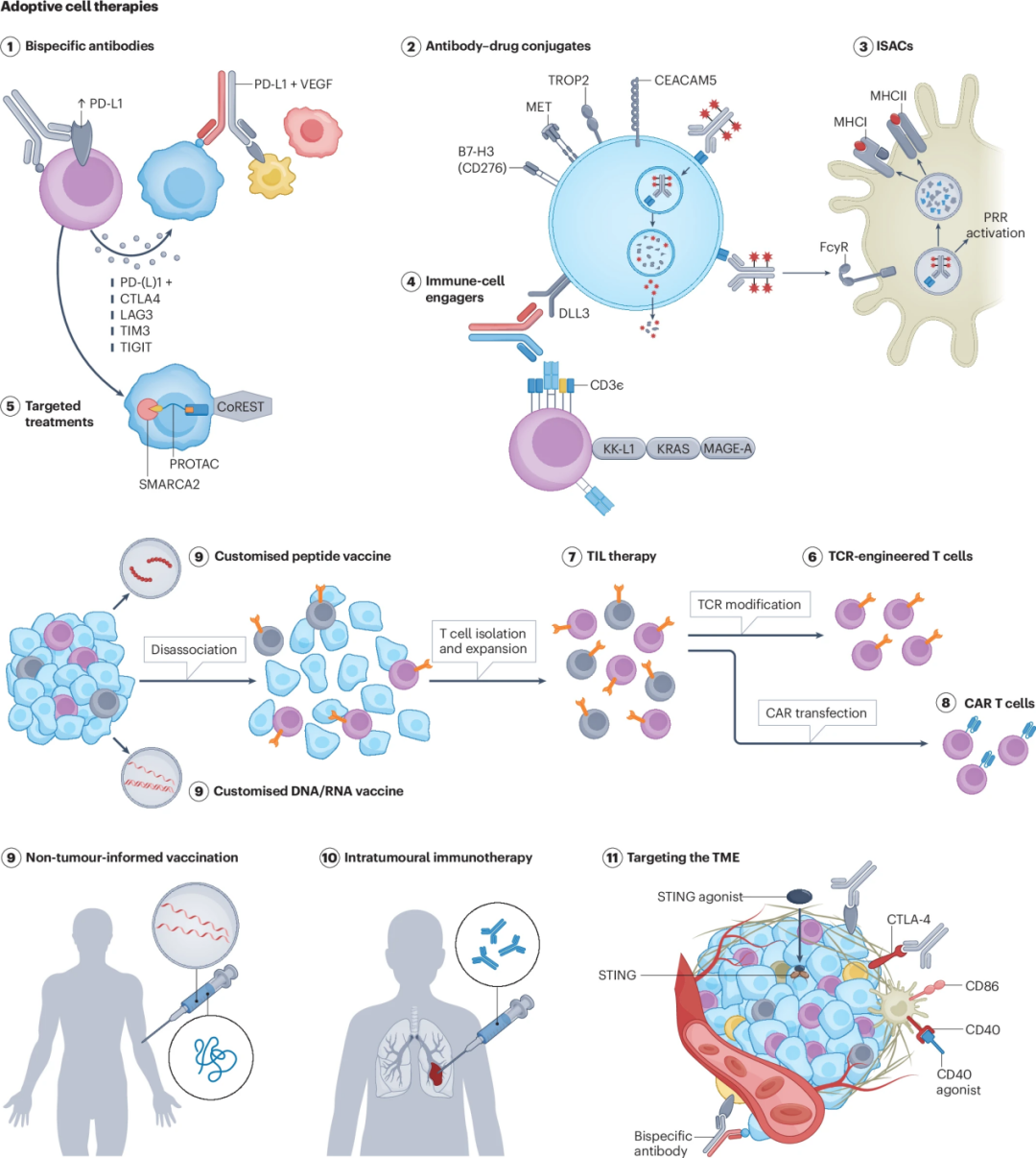 使用离体扩增肿瘤浸润淋巴细胞(TILs),或是装备转基因TCRs或嵌合抗原受体(CARs)的T细胞的自体细胞疗法,也是ICI耐药实体瘤潜在的治疗新选择,它们的理论作用机制颇具前景,但技术层面仍面临许多挑战,如需要提供包含足够数量、功能尚可免疫细胞的新鲜组织样本,用以制备自体治疗产品,制备同样耗时较长,多数患者并不满足条件,甚至不能入组临床研究;且初步临床数据显示,细胞疗法可能对ICI耐药NSCLC疗效有限、毒性较大。